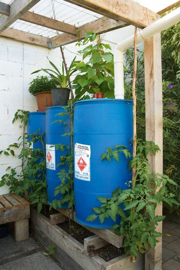 Consider a wide, watertight container with a removable lid to allow easy cleaning. A 44-gallon plastic drum with a hole in the lid to insert the downpipe is also ideal. If space allows, link two or more vessels together to catch overflow. Dark-coloured drums prevent light exposure and algal growth.