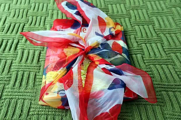 Furoshiki (also sometimes called tsutsumi) is the ancient Japanese art of wrapping fabric and tying it different ways to present and carry a gift: no paper, no sticky tape, no ribbon and no waste. A piece of fabric is simply folded around the package and can be adapted for just about any wrapping purpose. Not only does the giver have the joy of presenting an eco-friendly cloth wrap, the recipient has the pleasure of untying, reusing and on-gifting the fabric with a present of their own. Consider it the ultimate everlasting pay-it-forward wrapper.