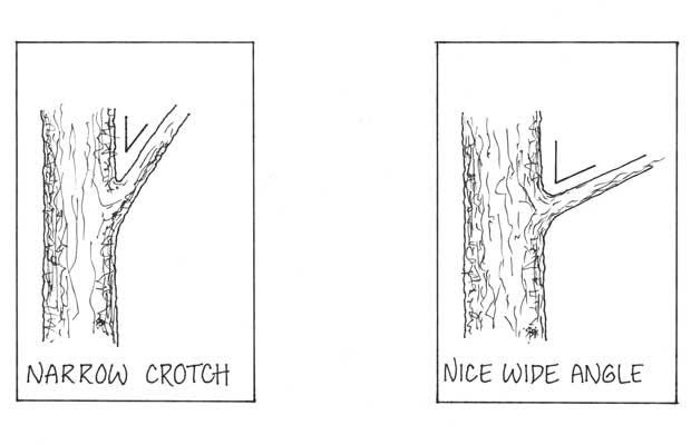 It’s important that branches come from the tree at a nice wide angle (30−45° from the vertical). Any less than that is called a narrow crotch – a problematic thing that splits away from the trunk under pressure of fruit load or big winds. A narrow crotch is a weak join that no amount of tree trickery can overcome. Remove it when it’s young. Another branch will grow.
