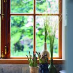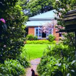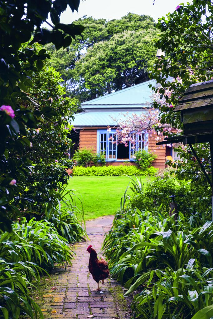 Kingfisher blue windows reflect the coastal environment and distinguish the house from the tapestry of greens in the surrounding trees. Iceberg roses and low-trimmed star jasmine are happy bedfellows with native red tussock.