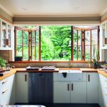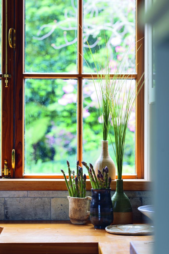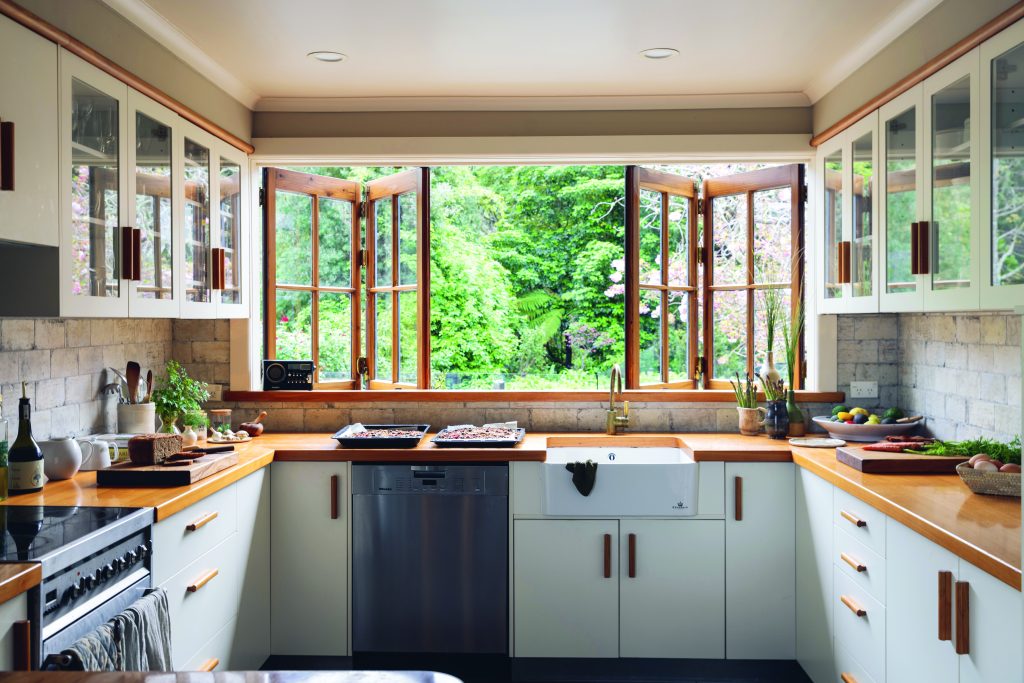 - The calm colours of the kitchen with its rustic-look wall tiles, macrocarpa benchtop, plain cupboard fronts with simple rimu handles and timber bi-fold windows frame a vista of lush green.