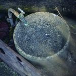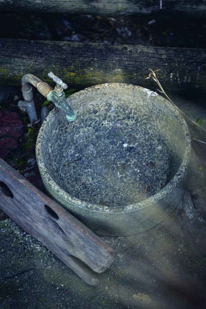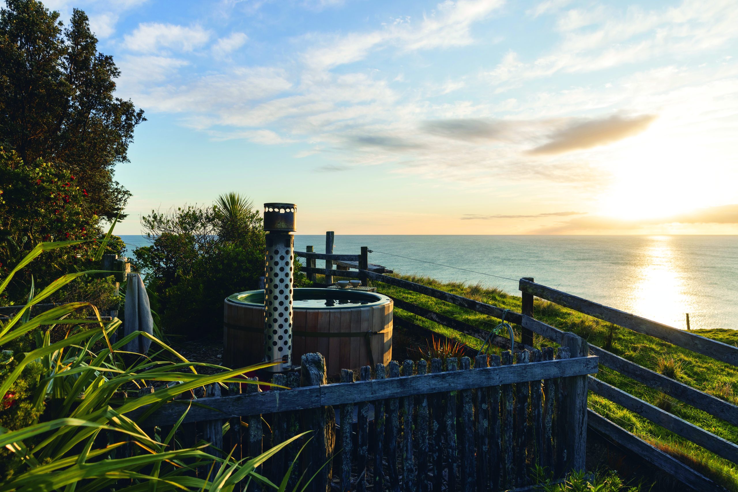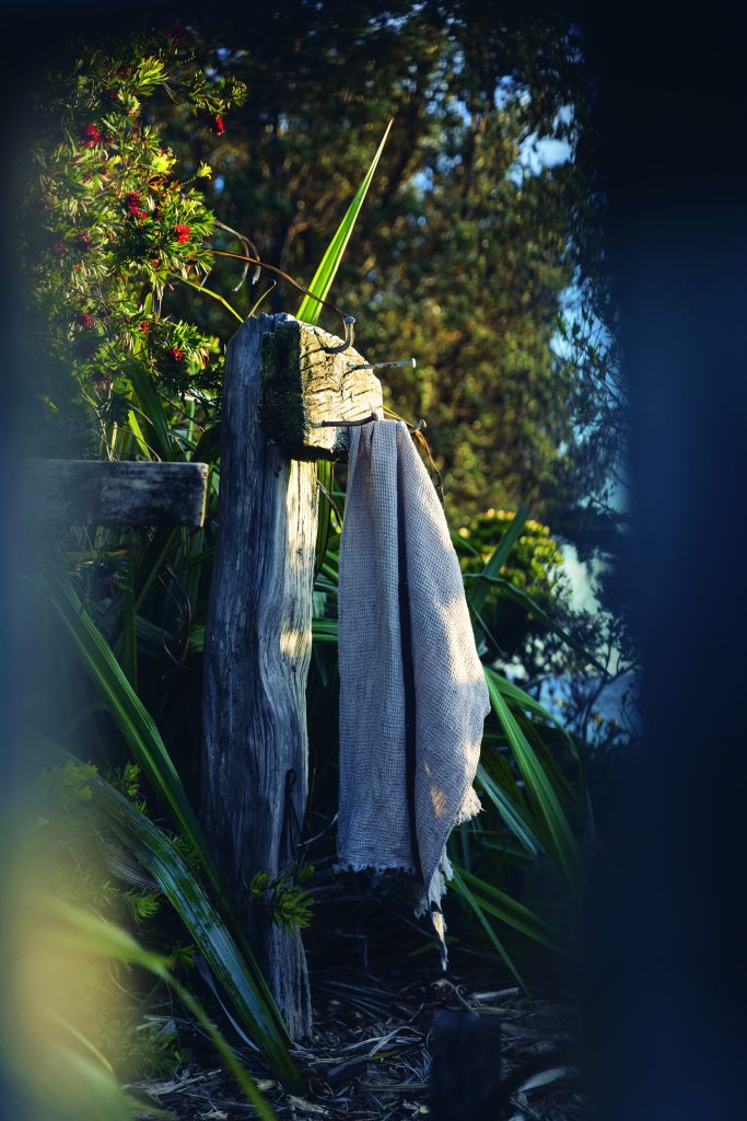The hot tub requires no chemicals, electricity, pumps or plumbing and uses either fresh or seawater. Old tōtara fence battens and posts are a decorative screen.