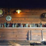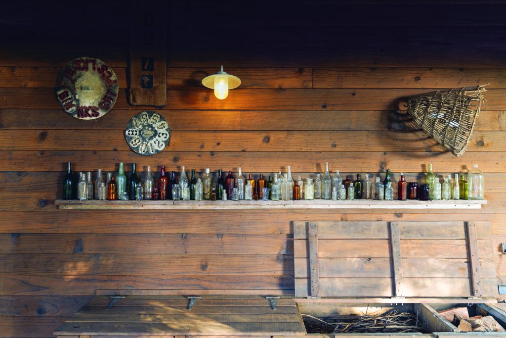 - History speaks through each object in this display above the firewood boxes. Bottles in muted colours and shapes were found over the years near an abandoned railway construction camp on the farm, the three wool-bale stencils on the wall are no longer used, and the fishing net came home with the family after they’d lived in southern Africa.