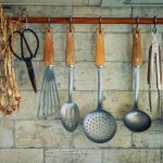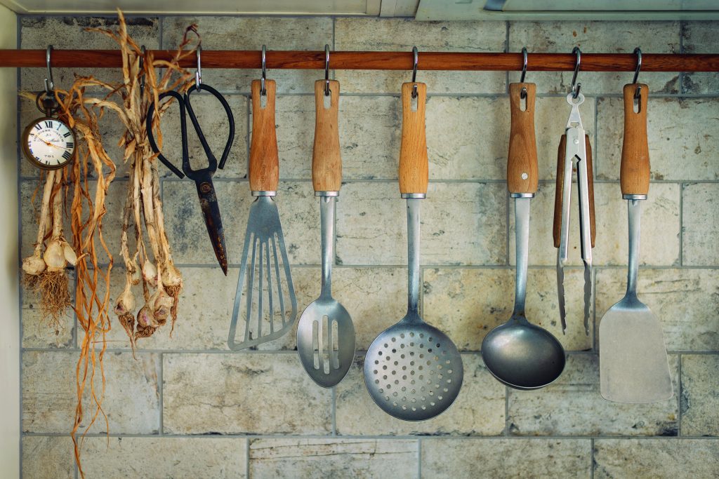 - Wooden-handled kitchen utensils were sourced to match the overall kitchen theme and attached to a simple pole by stainless butcher’s hooks.