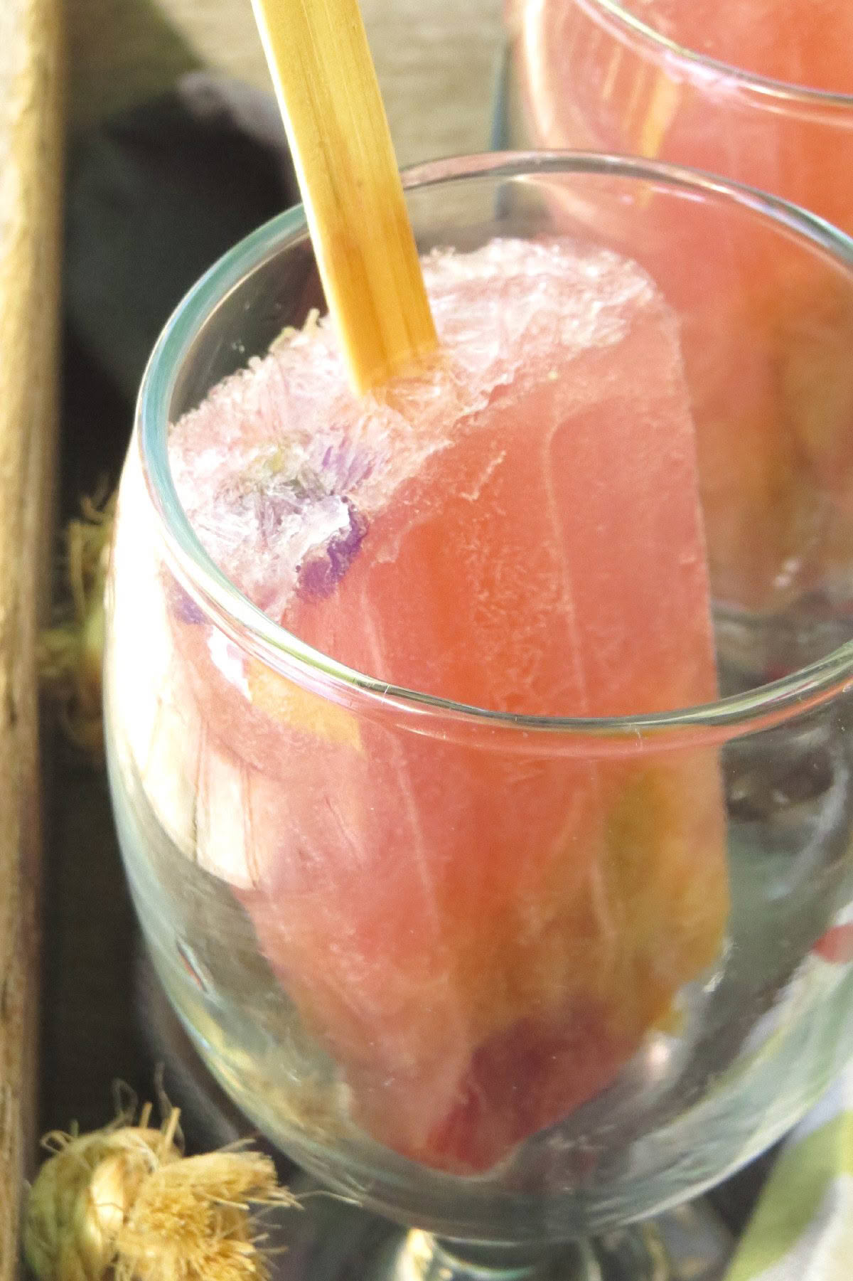 Tips: Freezing overnight made for a great, firm result: a beautiful soft pink blush, a fresh and crisp flavour (not a sweet ice pop by any means) with some soft rhubarb to munch on too. I even added an edible flower for extra colour before setting. The higher the alcohol content, the less likely it is to freeze.