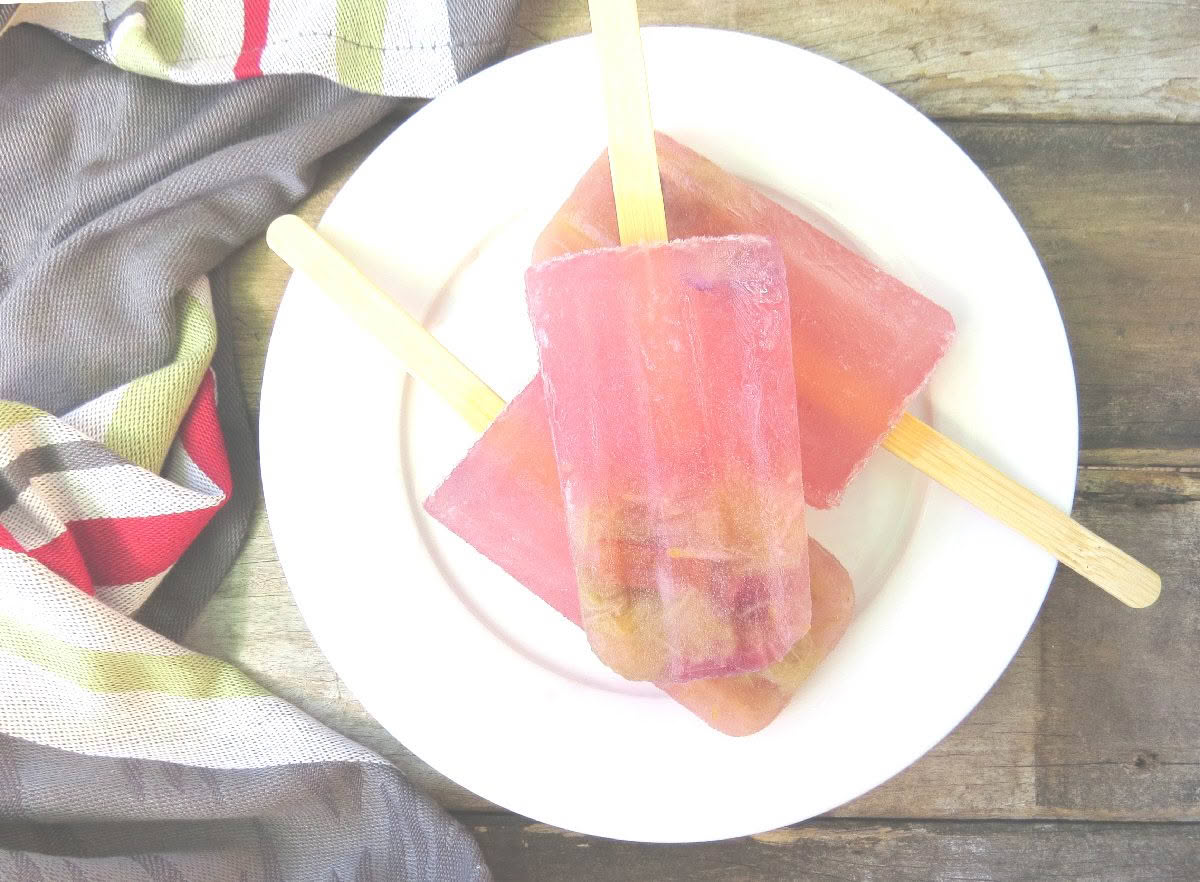Scoop a teaspoon of stewed rhubarb and place into the ice pop moulds, top with rosé liquid and float a washed edible flower on top (to be fancy). Add your ice pop stick and place in freezer on a flat surface, overnight.