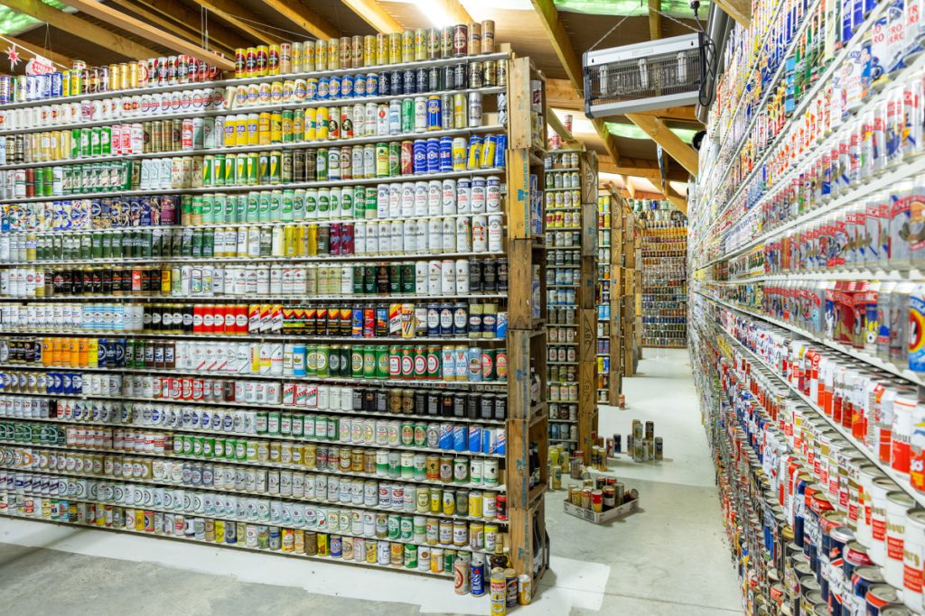 Exploring the rooms and bays inside this beer can shed is an eye-opener. Row upon row of cans are stacked to the roof, grouped by country of origin. The ring pulls are intact but the cans are empty of beer, having been holed at the bottom. Some came empty, while the contents of others have been happily consumed. The largest is a 10 litre can from Germany, while the smallest is a tiny Japanese 135 ml specimen.