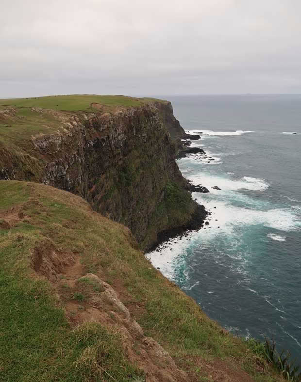 On the side of the Cape on the south-east coast is Thomas Mohi Tuuta (Rangaika) Scenic Reserve. It’s usually a six-hour walk to see the dramatic cliffs and their 200-metre drop to the ocean but, thankfully, a local allows us to drive through his farm to see the views, so we don’t have to put on our tramping boots.