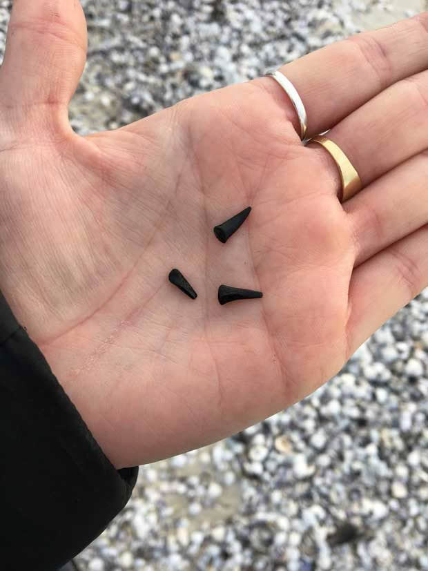 The shark teeth in the lagoon are a little younger than that, a mere 30 million years old. Finding a shark tooth on the shelly shore is like finding a needle in a haystack – but I count myself lucky when I manage to find three little teeth.