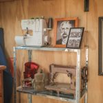 - A shelf of stories: a portrait of Oscar Eide from the 1930s, pages from Hugh Ramage’s In the Midst of the Boom chronicling Whanganui’s textile history, Nikolai’s mum’s well-loved overlocker, an antique Singer rescued for restoration, a once-rejected lining sample now reborn as an event tablecloth, and a WWII canteen – the kind Oscar Eide produced while crafting bags, water vessels and tents for the Pacific war effort.