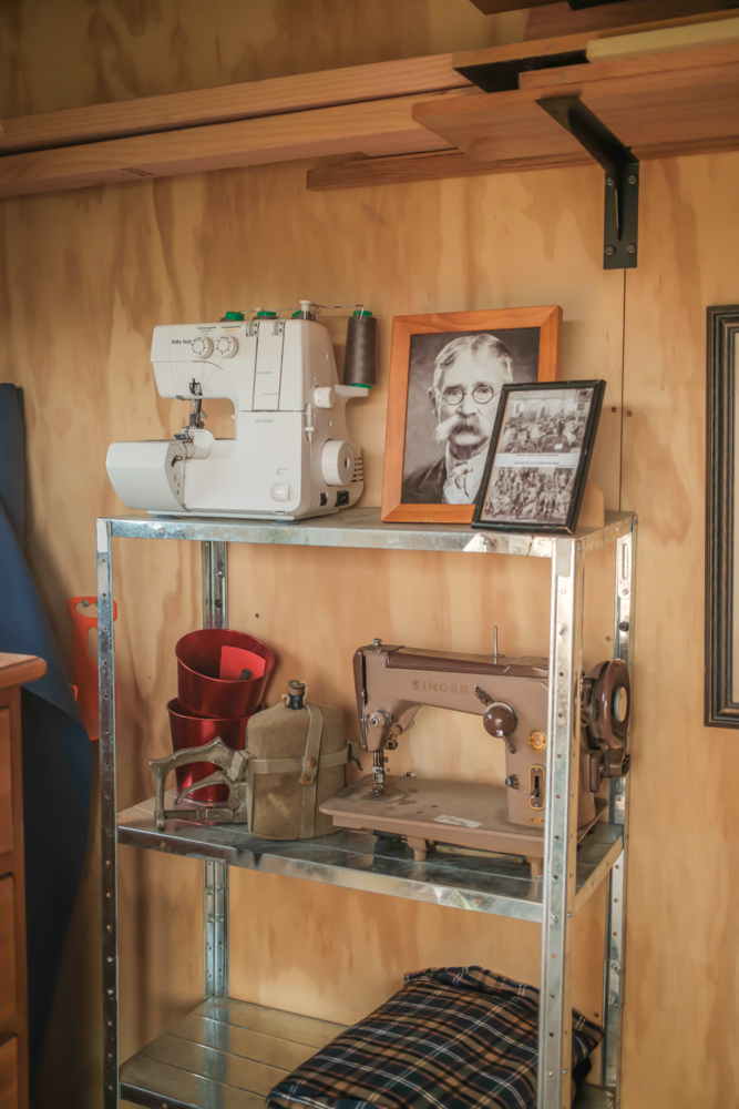- A shelf of stories: a portrait of Oscar Eide from the 1930s, pages from Hugh Ramage’s In the Midst of the Boom chronicling Whanganui’s textile history, Nikolai’s mum’s well-loved overlocker, an antique Singer rescued for restoration, a once-rejected lining sample now reborn as an event tablecloth, and a WWII canteen – the kind Oscar Eide produced while crafting bags, water vessels and tents for the Pacific war effort.